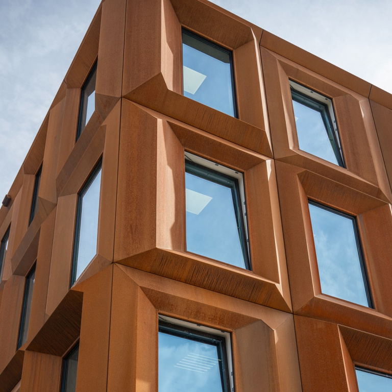 De gevel combineert cortenstaal, kunststof kozijnen en strovulling tot stoer en modern geheel. Dat zorgt niet alleen voor een bijzondere uitstraling, maar ook voor een lange levensduur en een lage milieu-impact.