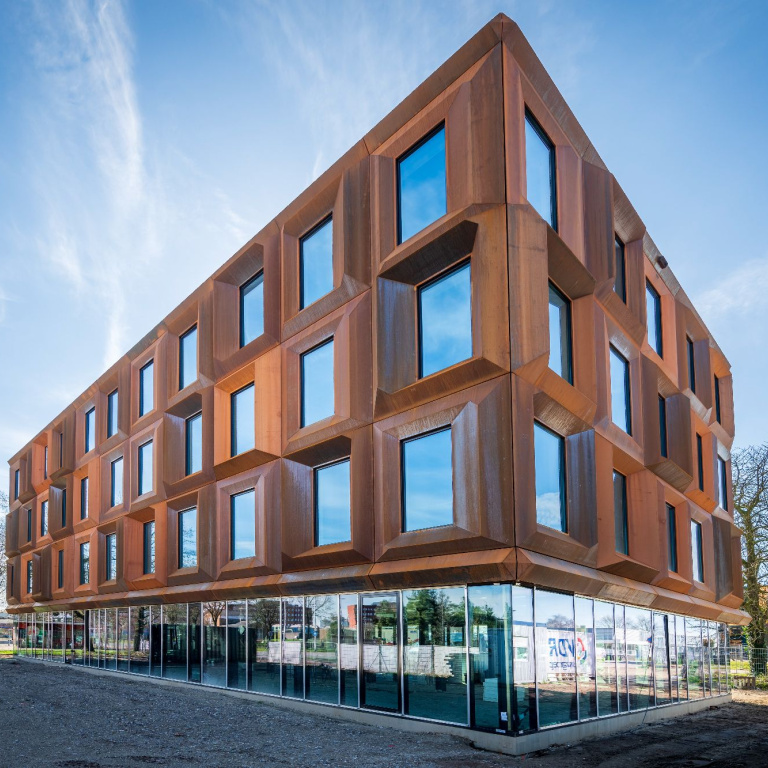 "Gebouw X onderscheidt zich door zijn doordachte losmaakbaarheid: een helder systeem van herhaalbare elementen en kozijnmaten maakt hergebruik eenvoudig en zinvol. De combinatie van cortenstaal, kunststof kozijnen en strovulling geeft het gebouw zowel ee rauwe industriële als een duurzame toekomstwaarde."