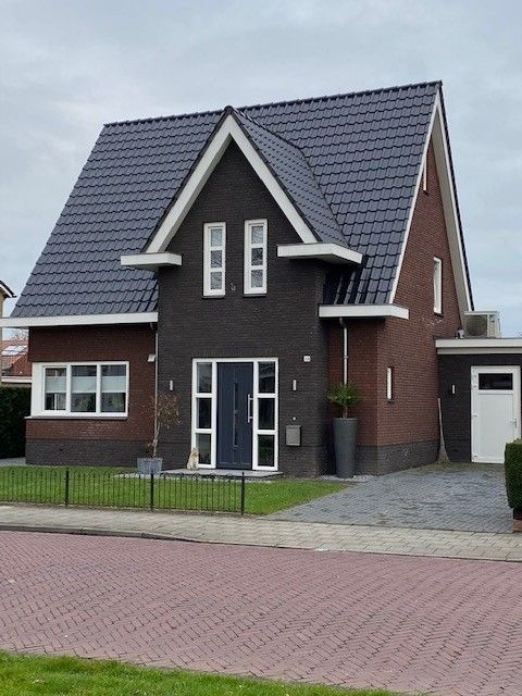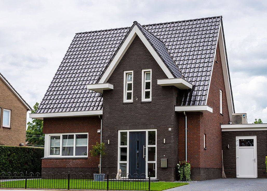 Nieuwbouwwoning met witte kunststof kozijnen en grijze voordeur