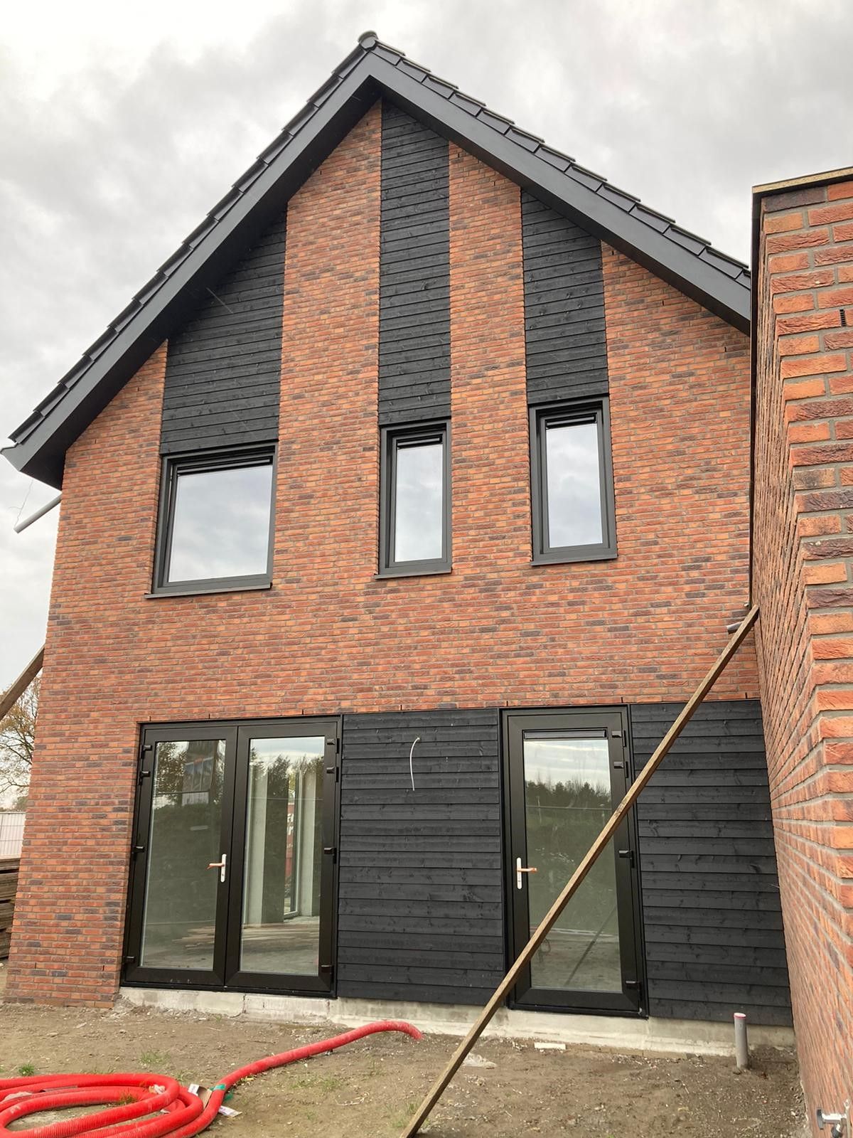 Nieuwbouw­woning met zwarte tuindeuren en houtaccenten