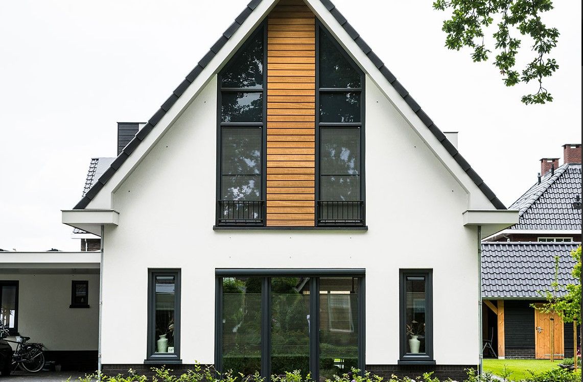 Strakke, moderne nieuwbouwwoning met zwart generfde kozijnen